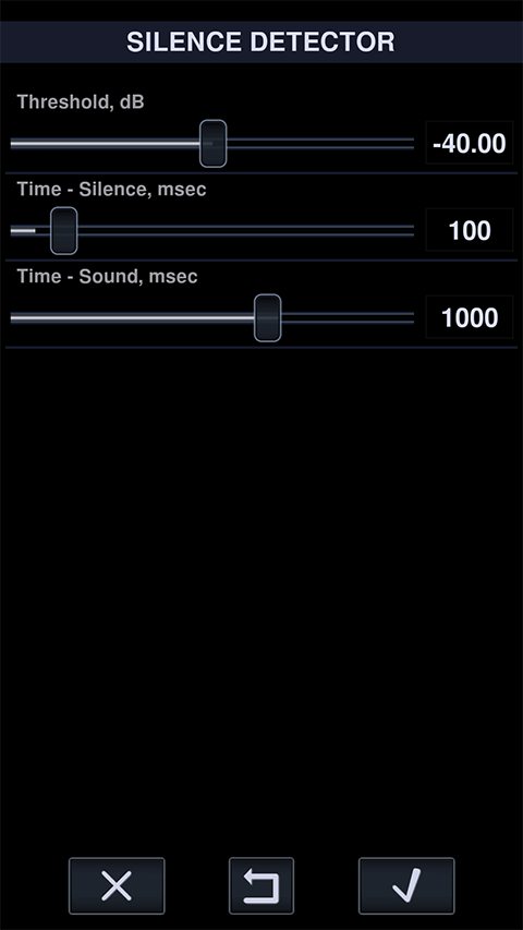 - Time - Silence: if any sound is detected inside this period the silence condition will not be cancelled